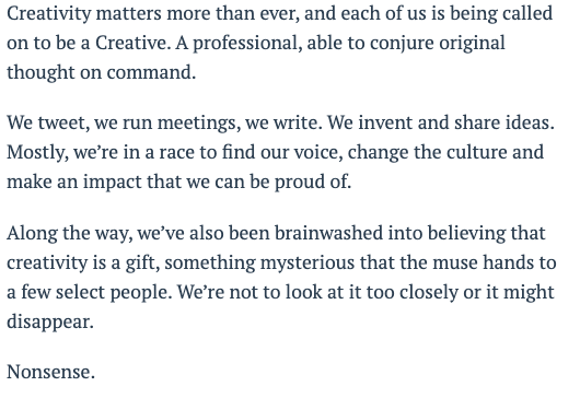 I love listening to podcasts or Youtube videos while I workout or clean or bake. Last week I listened to a couple interesting interviews with Seth Godin, author of several best selling books including The Practice and This Is Marketing. The following snapshot from his blog perfectly explains what his recent book, The Practice, is about and his take on creativity.
