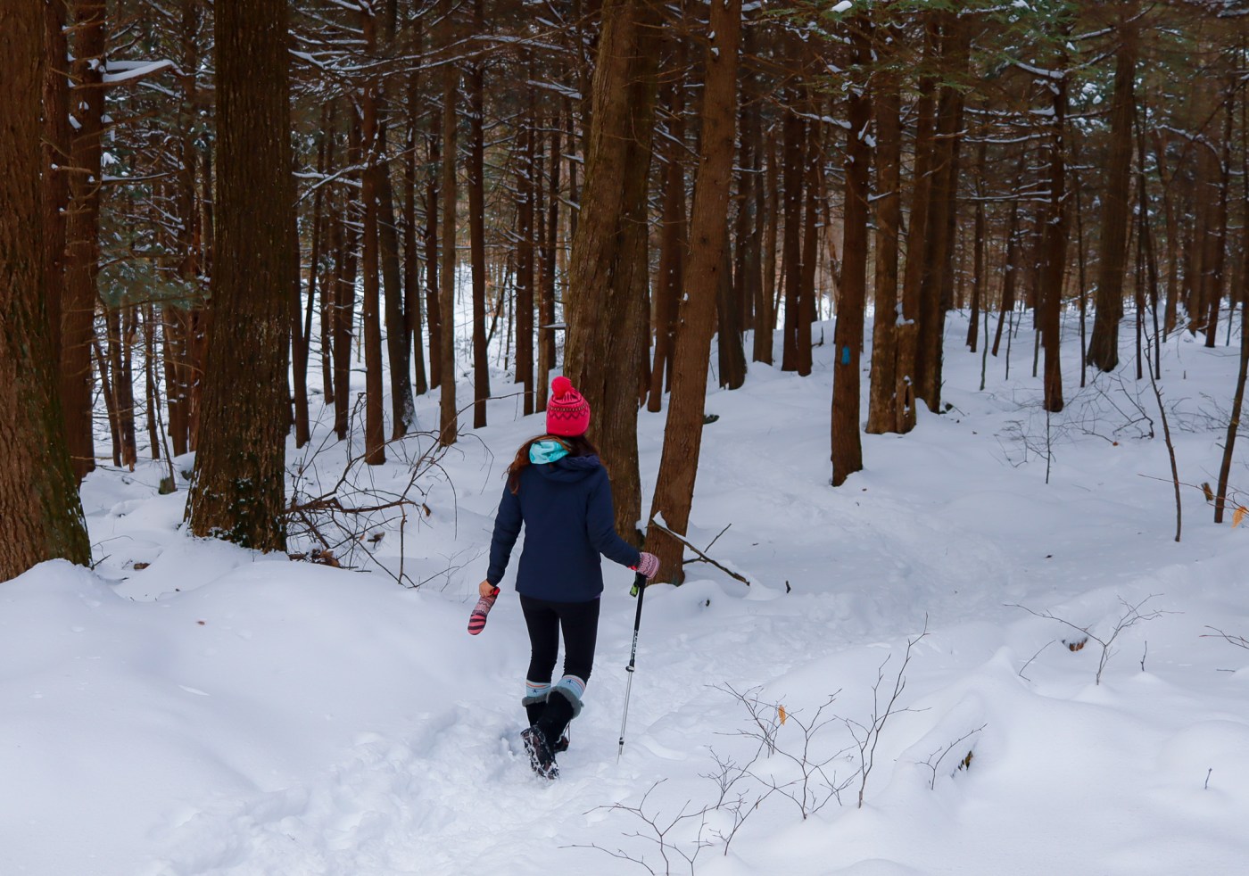 When in doubt, bring both! Bring both snowshoes and microspikes in the car and when you get to the trail take a look and see – has the trail been packed down (walked on) at all or are you looking at several inches of fresh snow? As people walk through and in the snow, the snow gets packed down and a little trail is made! Even after just a couple people have been on it. Just note that again, in higher elevations, the trail may be broken out at first (nicely packed down) but as you continue the hike you might encounter snow that requires snowshoes as maybe people turned around and/or the snow just gets deeper as you go up! My friend, Dave @pandemichiker, hikes in NH often and suggests using zip ties to carry your snowshoes along with you in case the conditions change as you go!